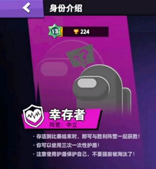 基本认知:这个角色可谓是纯天然无害角色,对大局基本没啥影响,在对局中当个混子角色躺赢就行,当被一些人追杀或在可疑人物旁边时,你可以开出护盾,防止被杀死失败,和你认为优势大的阵营一起合作,方可获胜。