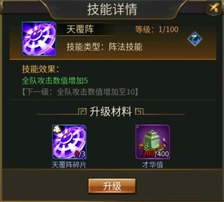 升级技能需要消耗对应的阵法碎片和才华值,且等级越高需要消耗的材料越多。以天覆阵为例,从0级升级到1级需要消耗2个天覆阵碎片和200点才华值,从1级升级到2级需要3个天覆阵碎片和400点才华值。