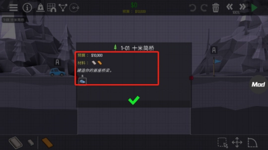 4、每个关卡能够使用的道具以及预算经费均存在差异,玩家只需利用规定道具在预算范围内搭建大桥,使小车顺利通行,便可成功通关。