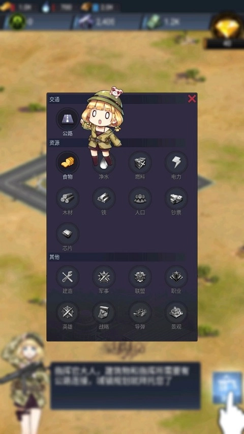 2、点击左侧的“建造”功能,这里有许多设施可建造,交通包括公路,资源包括食物、净水、燃料、电力、木材、铁、人口以及芯片等。