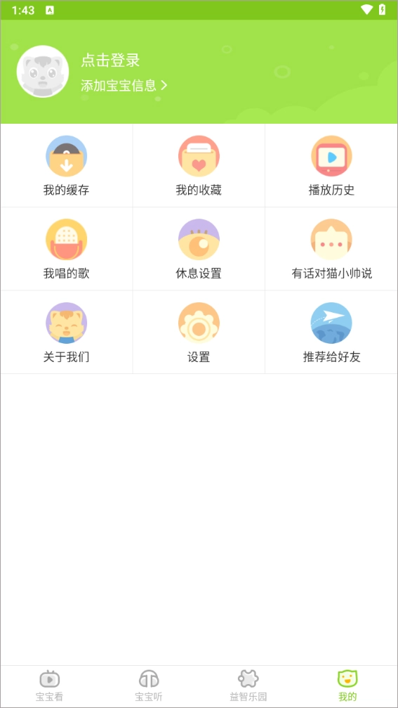 1、打开猫小帅儿歌app,在我的页面中,找到并点击休息设置选项
