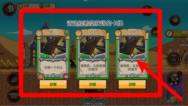 3.卡牌获取界面可在候选中选择,例如召唤“剑士”或金币“小钱袋”;根据局势取舍,保证经济与防御的平衡推进。