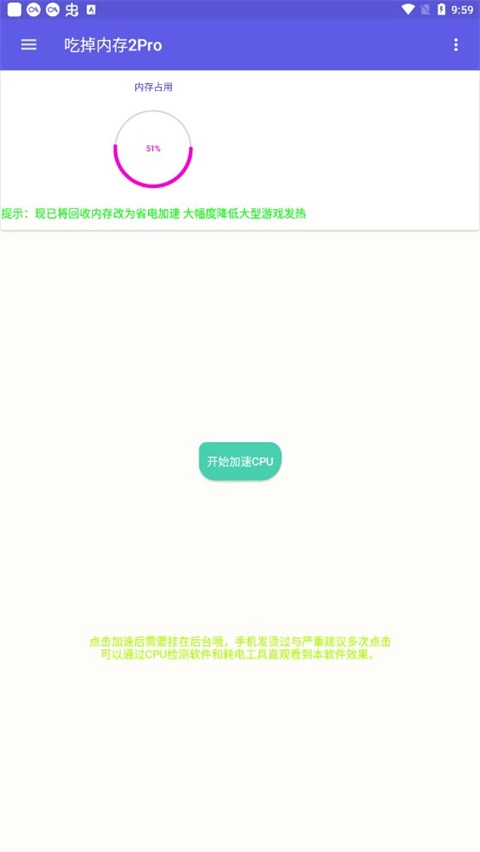 4、点击加速后,请将软件挂在后台运行。若手机发烫过于严重,建议多次点击加速。您可以借助CPU检测软件和耗电工具,直观感受本软件的效果。