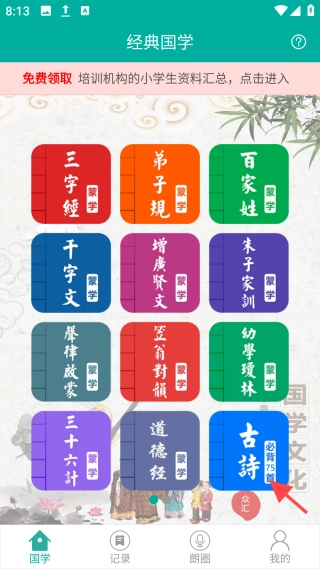 3、打开【国学】界面,挑选想朗读或收听的国学经典书籍。