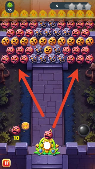 2. 用鼠标或者手指在屏幕底部拖动炮台来瞄准,点击或者松开即可把泡泡发射至顶部的泡泡群里。