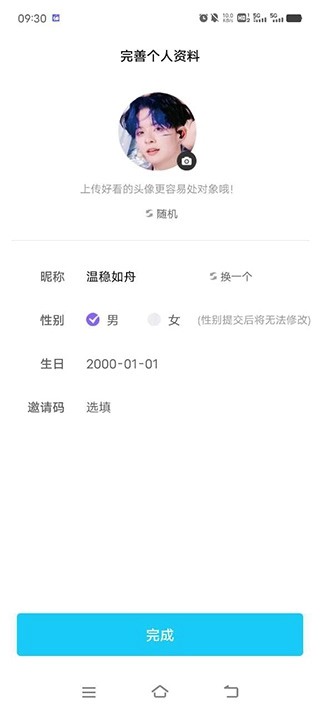 1、第一步,下载app并完善个人资料信息。需注意,性别一经选定便无法更改。