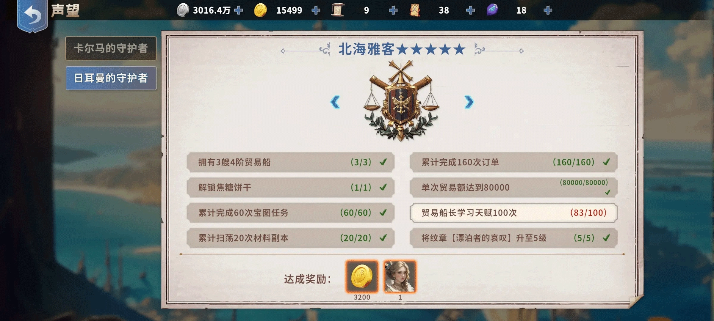 3、单线贸易问题:橙色阶段之前跑双边,当两边都开启了第一个橙色货物后,想必你的船只与贸易船长也具备了一定实力。此时,可在马卡尔和日耳曼这两条线中选择其一进行单边贸易,如此能够以最快速度获取金货材料。要是每天30次刷新没刷出想要的,还能转头去跑另一边的橙色货物,这不是一举两得嘛。马卡尔的声望任务奖励是雷利以及一套类似商城648的金装,日耳曼的贸易单价略高,声望奖励为载重藏品和卢克,后续奖励可通过声望任务的左右箭头查看,大家可依据自身的发展进度与个人喜好来做出选择。