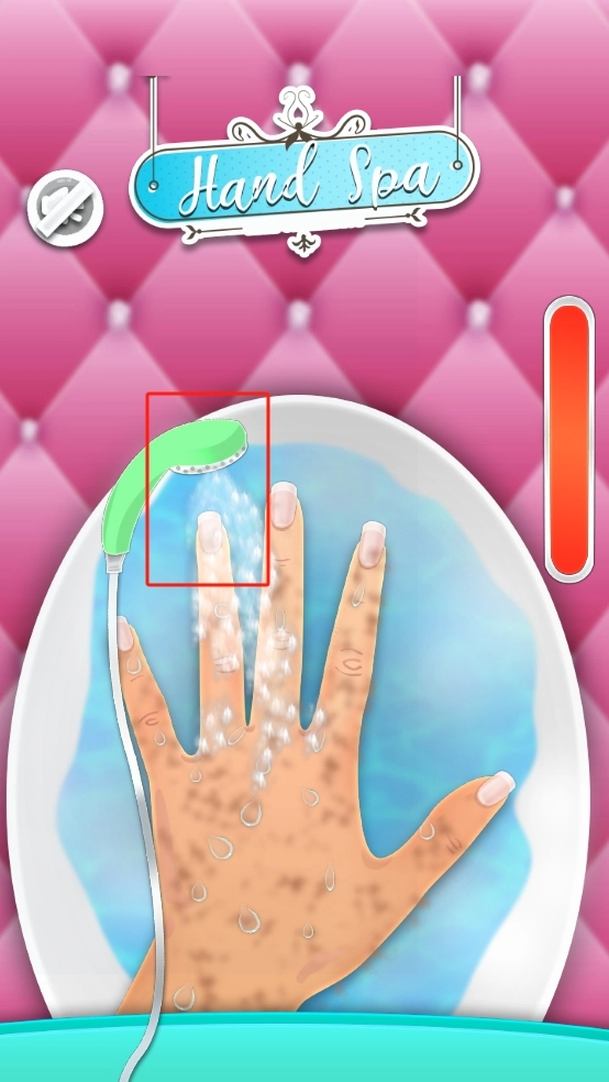 2、进入手部spa环节,用绿色喷头给手充分冲水清洁,去除手部污渍,让手部处于干净状态。