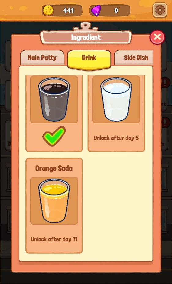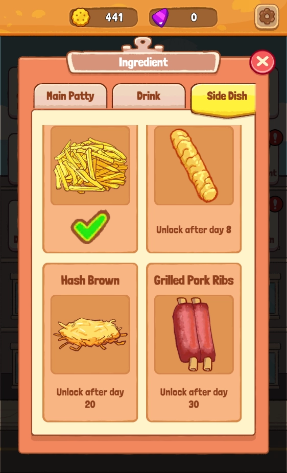 3、在此处,我们可以解锁新的汉堡食材,但得经营一定天数方可。