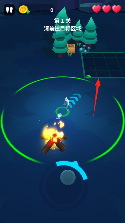 1、进入游戏到主界面,第1关,按指引【前往目标区域】,操控角色沿箭头,到绿色网格处。