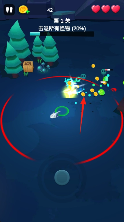 2、遇怪物,用旋转攻击红箭头范围,击退敌人,积累金币,完成击退所有怪物20%进度。