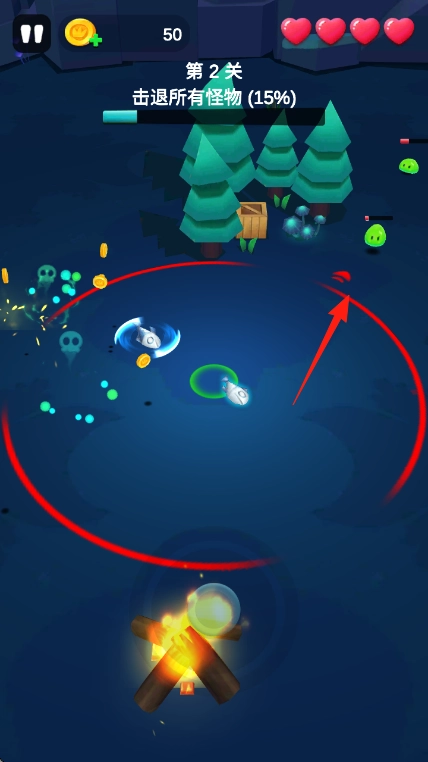 3、进入第2关,继续旋转攻击,清理怪物,推进击退所有怪物15%进度,守护血量爱心,通关升级。