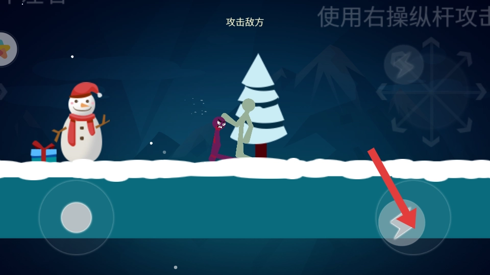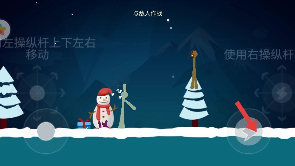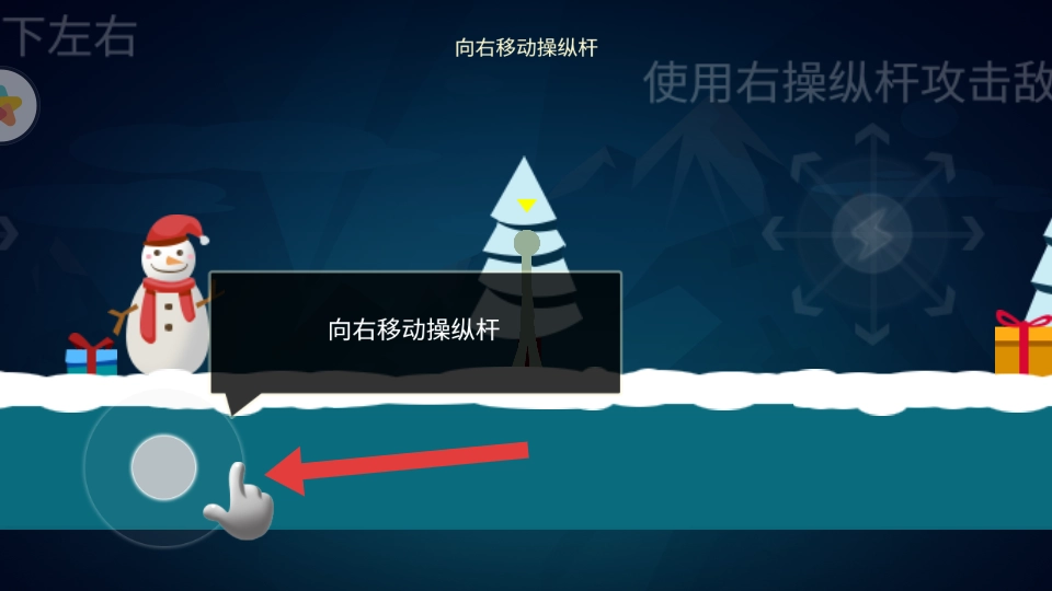 1、开场按提示,向右滑动左侧操纵杆,控制角色移动,让角色熟悉雪地场景的移动操作,为后续战斗做准备。