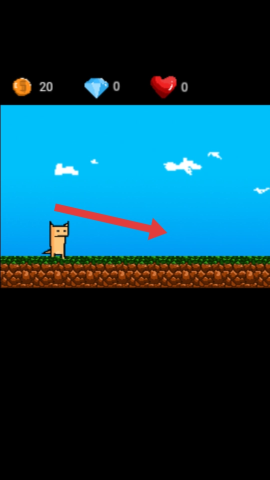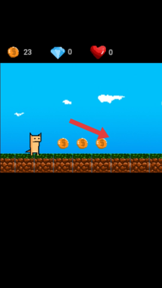 1、操控像素猫咪,屏幕隐含方向键,在草地场景移动,遇到前方有金币主动触碰,收集并增加金币数。
