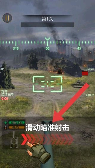 1、画面呈现了游戏的第1关,通过文字提示:滑动瞄准射击来进行操作,显示玩家处于瞄准的阶段,还未进行射击。