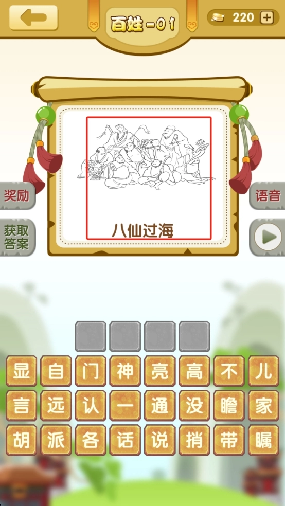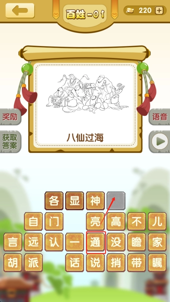1、开局我们选择关卡进入,关卡呈现八仙过海主题画面,下方排布众多汉字方块,需从方块里筛选与画面关联的字。