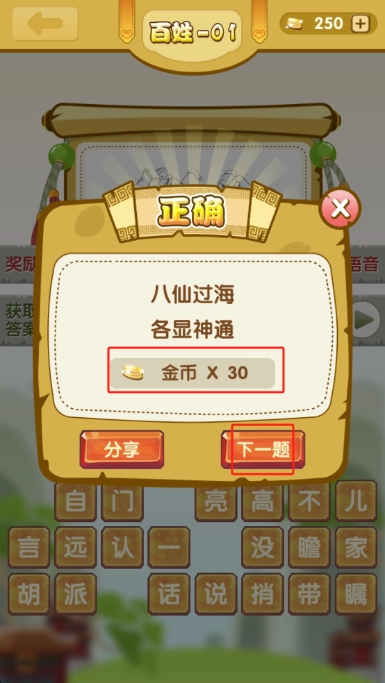 3、正确拼出成语后,界面弹出奖励提示,显示获得30金币,点击下一题按钮,进入新猜成语关卡继续挑战。