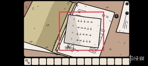 2、切换至二楼场景,点击书桌表面书籍获得白色提示便签,从展示架拾取胶卷与充电设备。