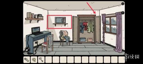 6、依据以下环境线索解开谜题:统计悬挂衣物上的纽扣数量,算出窗帘上绳结的总数,输入正确的数字组合来打开顶柜,从而获取数据硬盘。