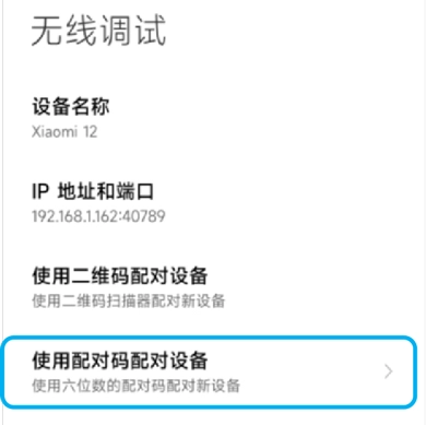 ③ 进入【无线调试】页面,点击【使用配对码配对设备】记住配对码