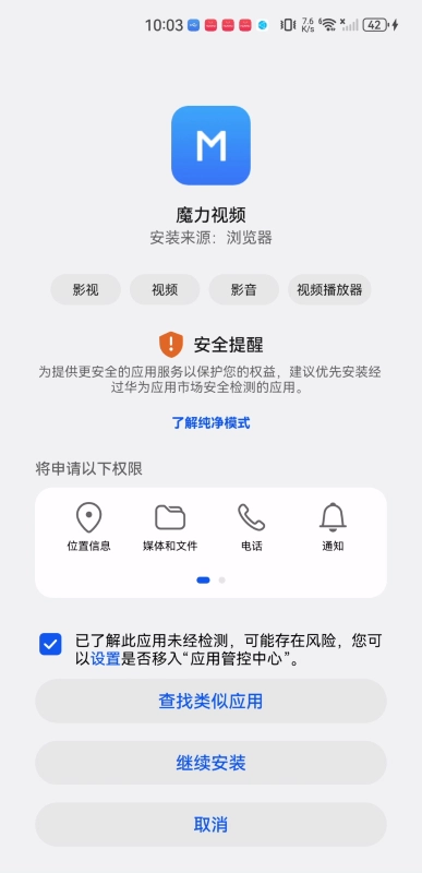3、接下来进行第三步,点击选中“已了解此应用未经检测……”选项,随后点击“继续安装”。(若出现安全提醒,无需慌张)