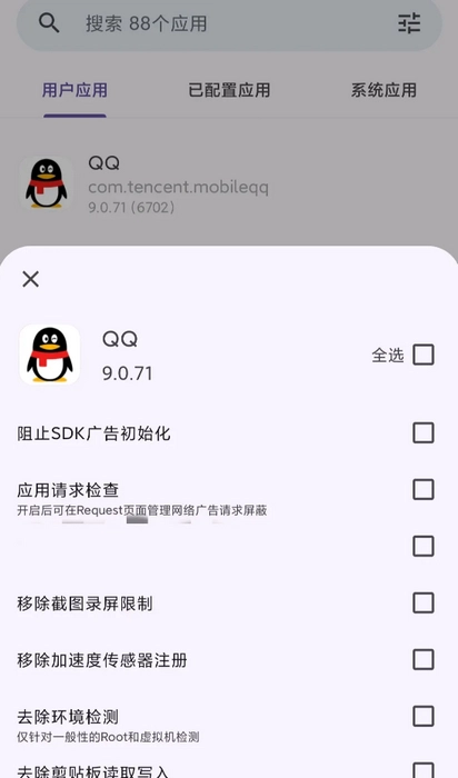 3. 在模块作用域内选择需要去除广告的应用程序。