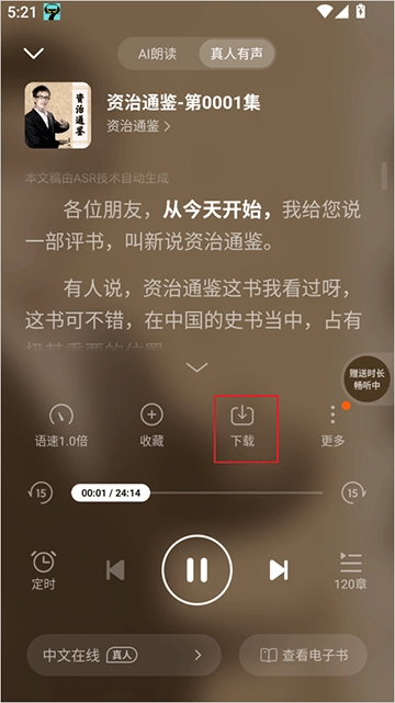 1. 寻得目标书籍后,点击进入播放页面,再点击“下载”。