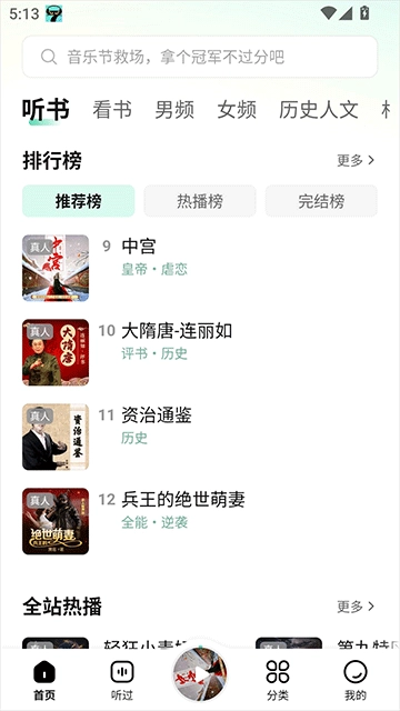 【品类丰富】都市霸总、现代言情、古代言情、玄幻武侠、相声评书、历史出版书籍、亲子情感等各类内容,任您畅听。