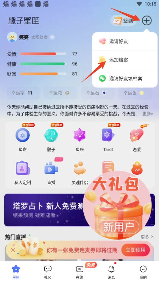 1. 开启橡子星座app,轻点右上角的【+】图标,接着点击【添加档案】