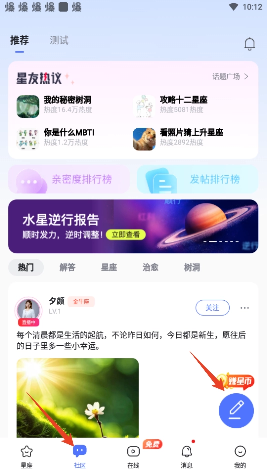 1. 开启橡子星座app,轻点下方的【社区】,接着点击【发帖】图标。