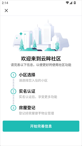 1、业主登录APP后,依照指示完成信息填写、实名认证以及房屋登记等操作。