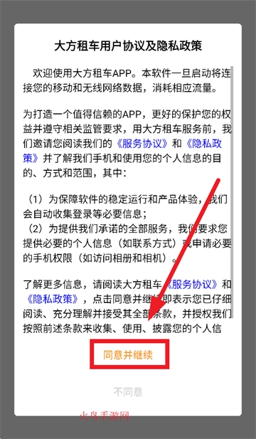 下载安装并打开大方租车app,在大方租车用户协议及隐私政策提示界面点击同意并继续