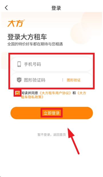输入手机号码,图形验证码,勾选阅读并同意 《大方租车用户协议》 和 《大方租车隐私政策》,点击立即登录即可
