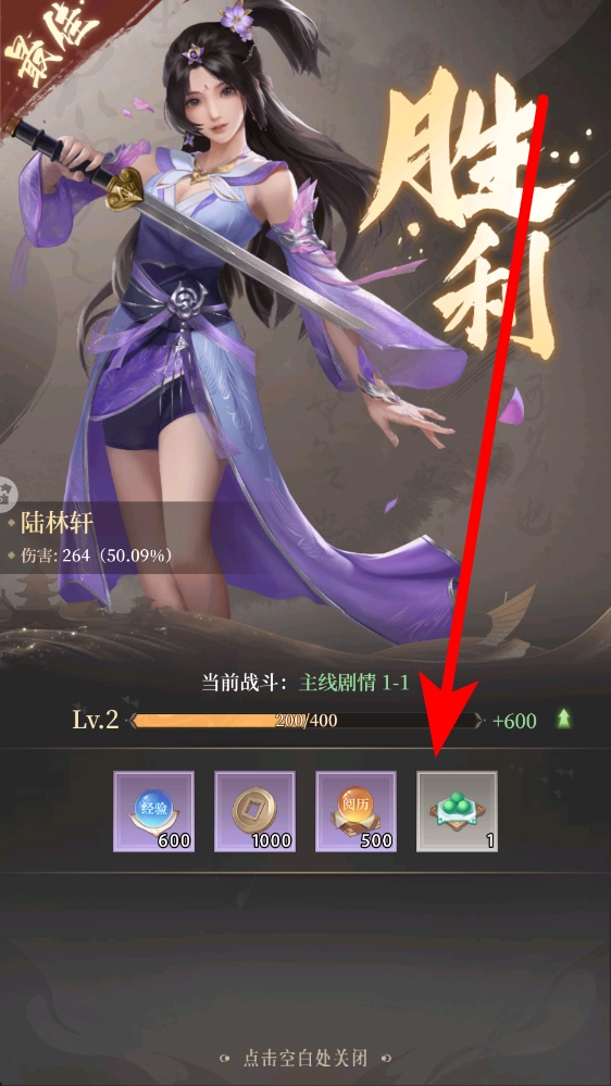 3、领取奖励,战斗胜利后,界面展示侠客升级与奖励,点击收取经验、金币、阅历及道具等奖励,积累资源用于后续侠客养成与阵容强化。