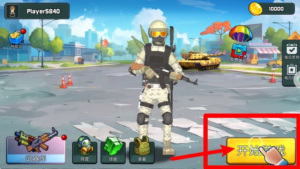 1.开始游戏:主界面中央角色下方,点击右下角“开始游戏”按钮即可进入战斗,操作简便直观。