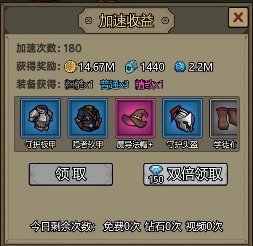 5. 装备:在游戏前期,玩家的战力主要通过装备来展现。毫不夸张地讲,一件优质装备能大幅提升你的战力,助力你更顺利地通关副本。因此,掌握正确获取更好装备的方法至关重要。装备品质从低到高依次为:白色、绿色、蓝色、紫色、金色、橙色、红色、暗红色,每一个品质等级之间的差距较为显著。装备品质与玩家当前所处的主线关卡等级相关,早期的情况我已记不太清,从400关开始会掉落金色优秀装备,560关起,能获得橙色上乘装备。到700关可得到红色完美装备,850关则会出现极品装备。平常获取装备,除了装备副本(这种获取方式最不可靠,基本可忽略不计)以及主线地图掉落之外,还有两种途径:一是离线一段时间后再进入游戏,领取离线挂机收益;二是在战斗界面领取加速收益。在离线收益和加速收益的装备领取界面,玩家可通过小sl操作刷新装备,直至刷出自己心仪的装备品质与数量。建议尽量刷出当前能获得的最高品质装备,数量在四个或以上为佳。