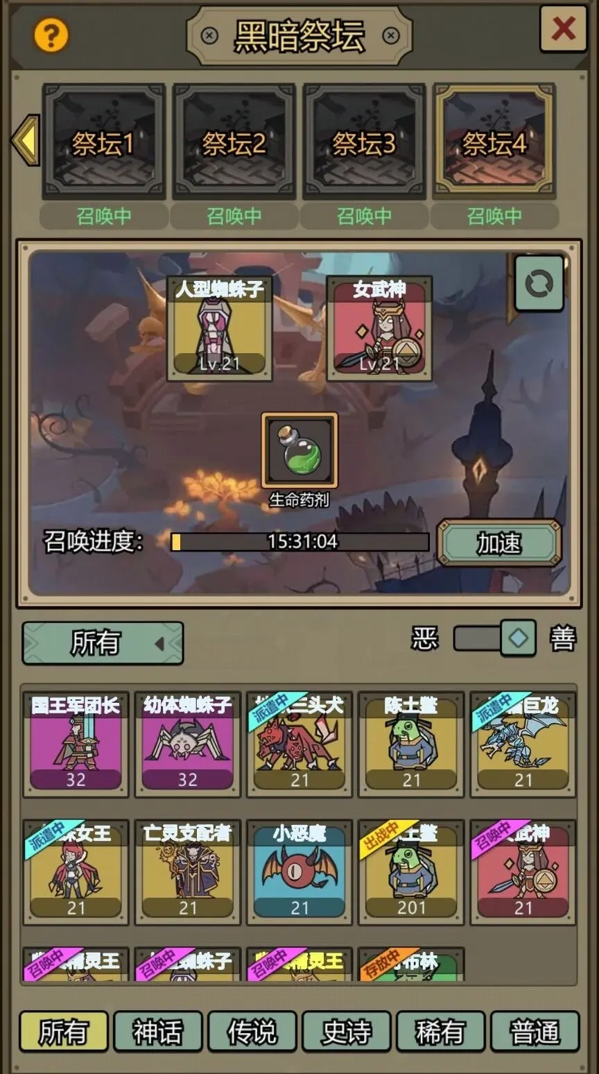 3. 开启黑暗祭坛生育英雄:这里详细说明一下,先着重培养一位英雄,比如精灵王或者矮人王都行,接着再安排几个辅助角色上场,一路推进到110关,就能开启黑暗祭坛。黑暗祭坛的功能很特别,把一个恶英雄与一个善英雄放在一起,16小时后(要是看广告的话,能加速到8小时),就会生出一个与恶英雄相同的英雄。要注意,生出来的英雄和恶英雄一模一样,恶英雄是谁,生出来的就是谁,其成长属性会依据善英雄的品质随机生成,还有一定概率出现变异属性(要是两个都有变异属性,生出变异的几率会增加)。 每个英雄的善恶属性在出现时就随机固定下来了,而且他们能生育的次数同样固定,恶英雄生育次数范围在0 - 3次之间。每进行一次生育,次数就减少一次。像恶3的英雄,就能生出三个和自己一样的英雄。生出来的英雄比抽到的品质更好,并且生出来的英雄同样有善恶之分。后来又增加了各种药水的使用,让生育结果更加稳定。要是放恶药水,生出来的必定是恶英雄,如此恶生恶,子子孙孙,无穷无尽。所以,抽到一个英雄,就有可能生出一个家族,直接升满星。开局要是抽到一个恶英雄,后续发展真的会省心不少。
