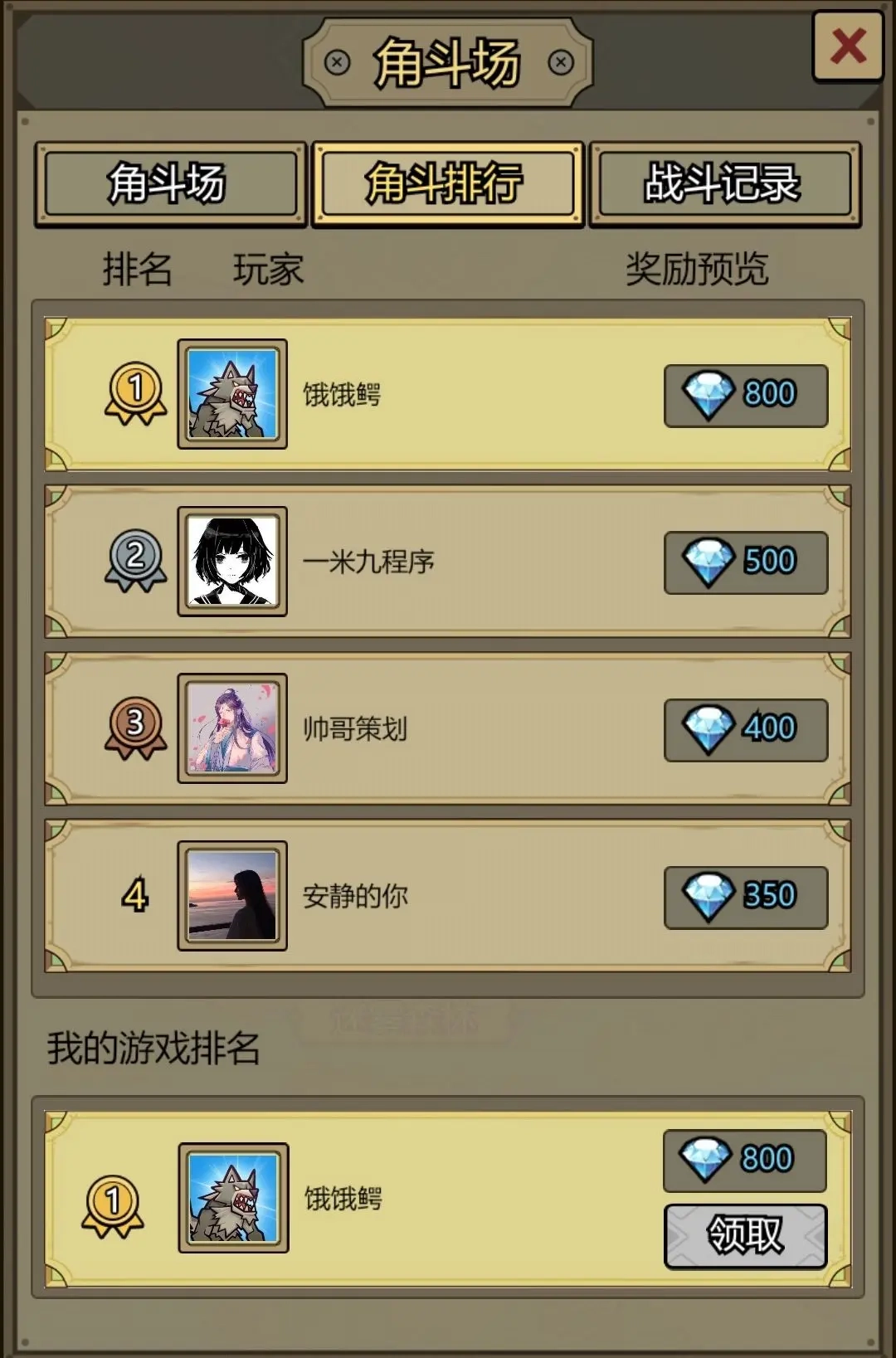 角斗场:三星角斗场,刷钻石的最佳场所,你值得拥有。早日达到第一名后,每日领取排名奖励800钻石,五次战斗每次给250钻,然后,通过看广告可以打20次左右,一次250钻,大家自己算。至于打上第一名需要的战力,一般一周内都能达成。