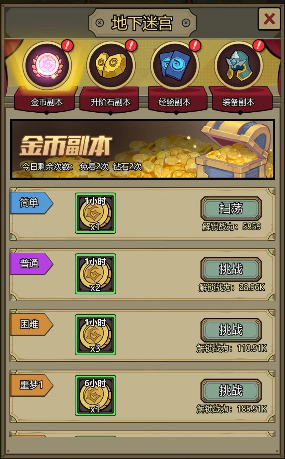 1.副本:地下迷宫:该迷宫四个小副本,170关以前还需要靠它获得一点金币和经验,170关以后不会再缺金币,经验也靠酒馆获取,其中的升阶石升星石由于至尊宝箱的原因基本不缺,所以也没啥用,而装备,奖励太低基本无视,综上,这是个酱油,170关以后不值得花钻石。