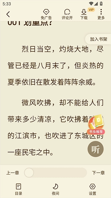 全免小说app界面简洁,广告稀少,为用户打造了优质的阅读体验。不仅如此,用户能够自由切换主题、字体、字号,还能开启夜间模式,尽享舒适阅读。此外,用户在阅读过程中可获取大量金币,完成任务更能免费领取会员。