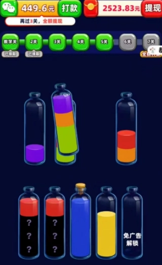 3、成功将所有的液体分开,并装满对应的瓶子即可过关。