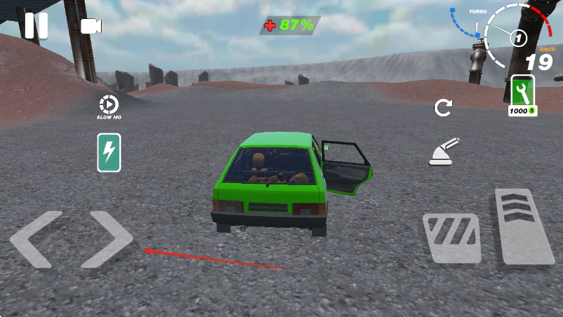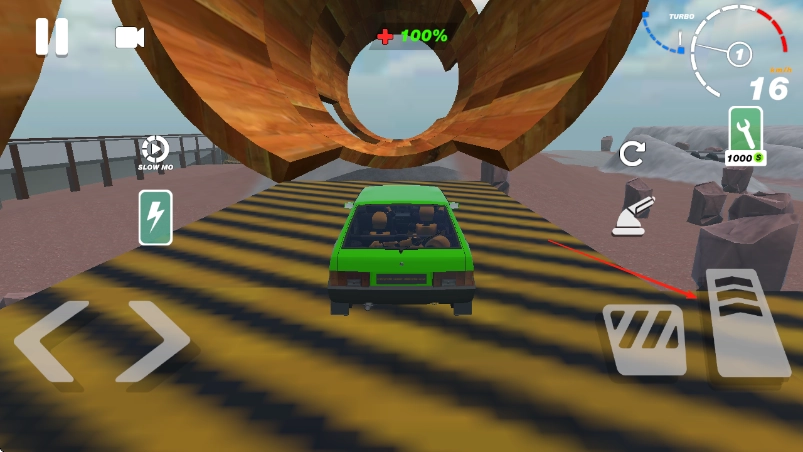 1、进入游戏,按红箭头方向点击右侧加速按钮,操控绿色汽车行驶,注意上方100%的车辆状态数值。