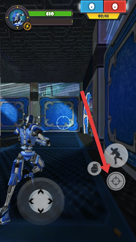 2、遇敌方目标,点击右侧瞄准按钮射击,比分落后时,人形按钮绕后突袭,丢手雷炸弹按钮清场。