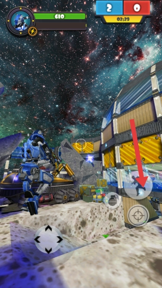 1、进入游戏,用左下角摇杆控制蓝色机甲移动,熟悉太空站场景,通过传送门切换至月球地图。