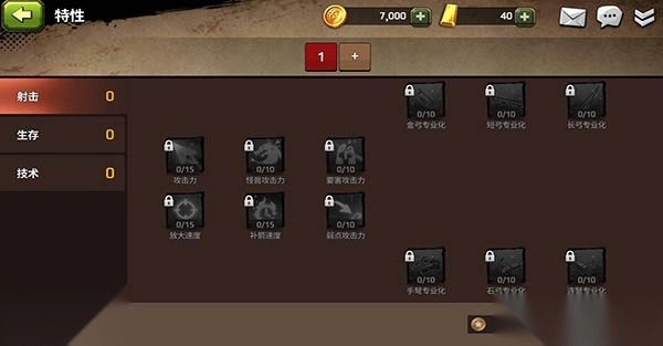 特性分为三大类:射击,生存,技术;