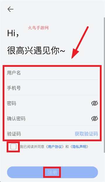 请依次输入用户名、手机号、密码及验证码,同时勾选“我已阅读并同意 《用户协议》和《隐私声明》”,最后点击“注册”按钮就能完成注册操作。