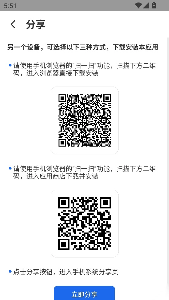 5. 这样一来,用户便能通过扫描二维码或者点击“立即分享”按钮的方式来实现应用分享。