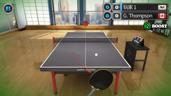 1、游戏开始后观察乒乓球位置按红箭头方向滑动屏幕操控球拍击球注意右上角比分和【BOOST】能量值。