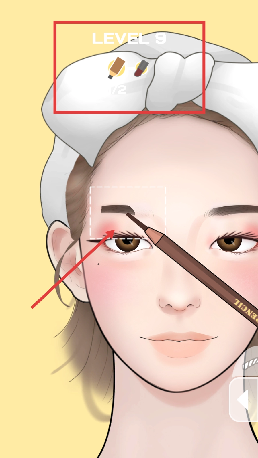 2、挑战【LEVEL-9】,拿眉笔勾勒眉形,完成【1/2】画眉任务,细化面部妆容细节。