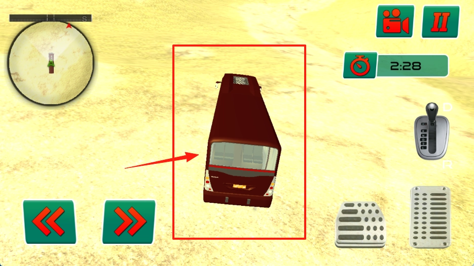 2、留意公交车左后轮底盘所在位置,踩踏图中所示踏板以操控车辆,使巴士平稳起步前行。